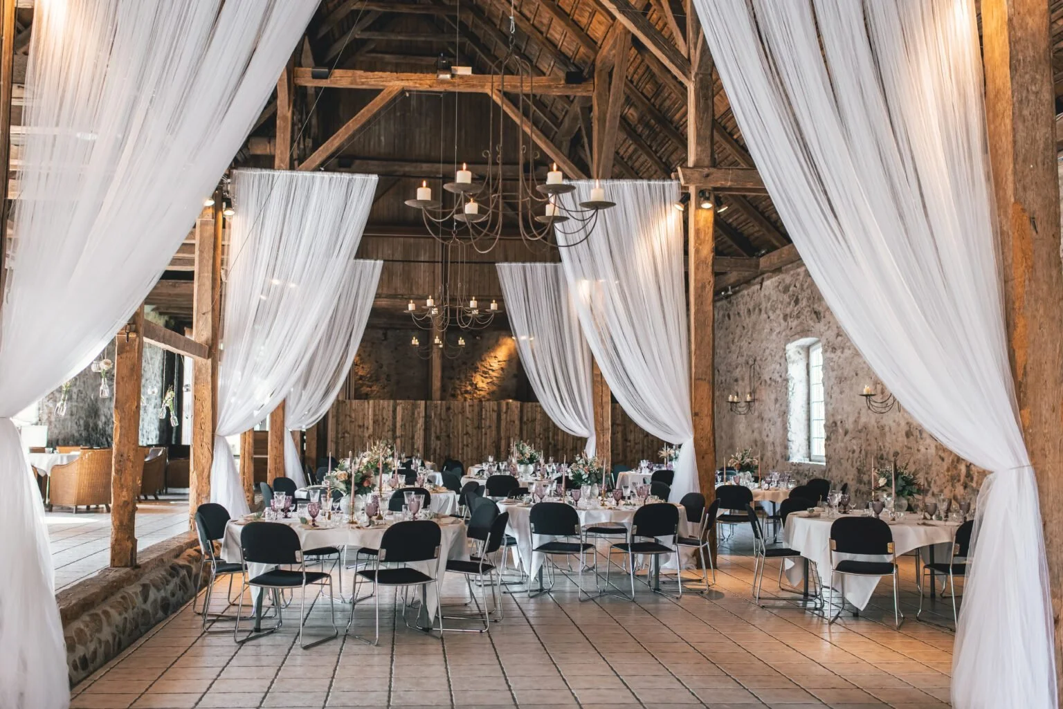 Originale håndhuggede bjælker, rustikke kampestensvægge og hele 11 meter til loftet gør 1877-Laden til et festlokale med wow-effekt, når gæsterne træder ind.